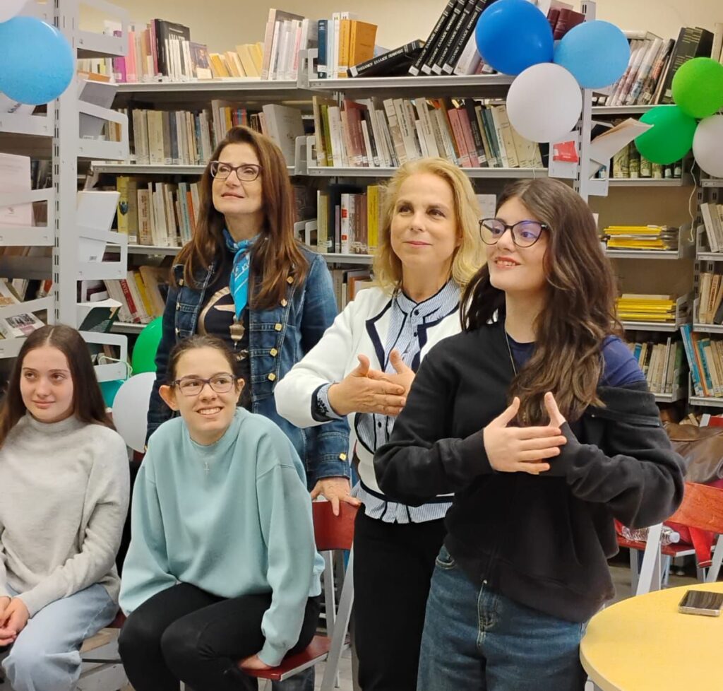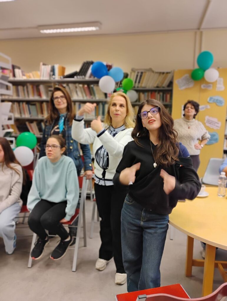 Η κα. Travaglione, καθηγήτρια ιταλικής γλώσσας, παρουσίασε ένα εξαιρετικό παράδειγμα συμπεριληπτικής εκπαίδευσης: τη δημιουργία μιας χορωδίας στη νοηματική γλώσσα, με τον χαρακτηριστικό τίτλο «Τα χέρια που τραγουδούν». Οι μαθητές μας ετοίμασαν συνεργατικά τις ερωτήσεις και παρουσία μαθητών και από τα δύο σχολεία, στη σχολική μας βιβλιοθήκη, δόθηκε η συνέντευξη, μια μοναδική ευκαιρία να γνωρίσουμε σε βάθος τη φιλοσοφία, τους στόχους και την παιδαγωγική αξία αυτής της πρωτοβουλίας.