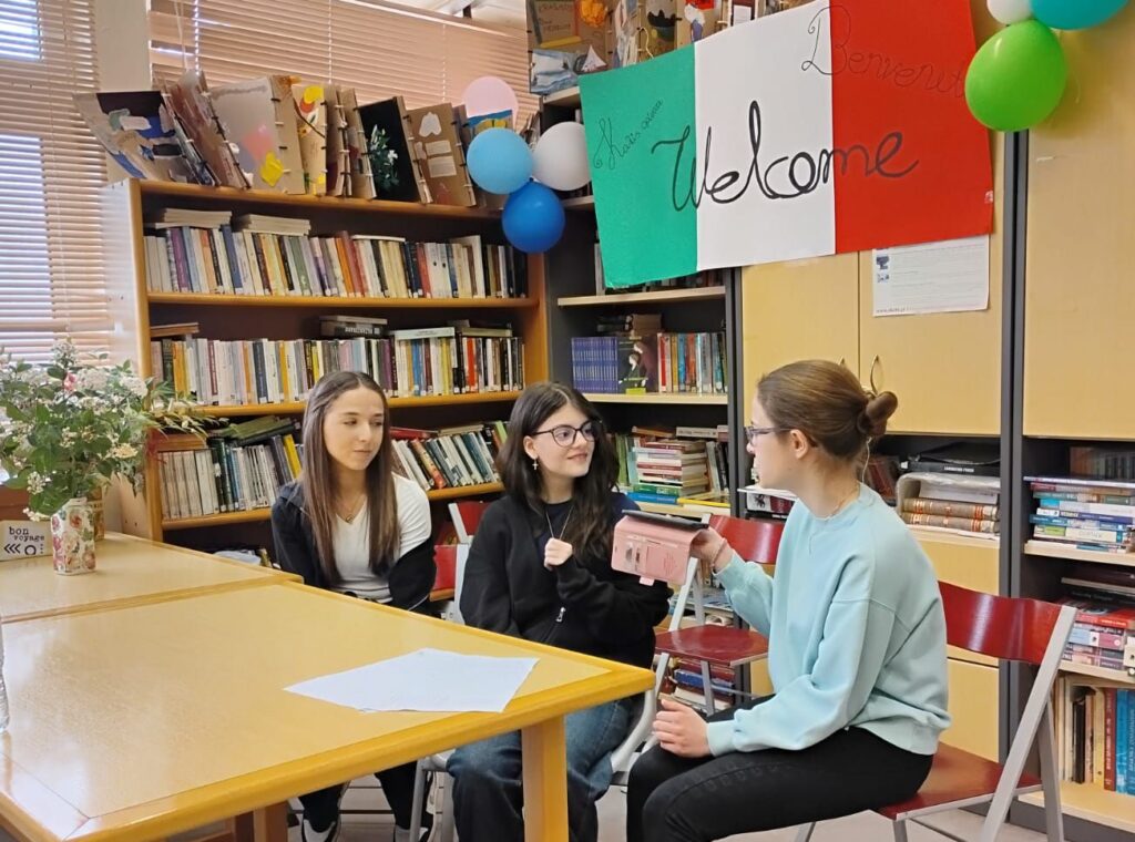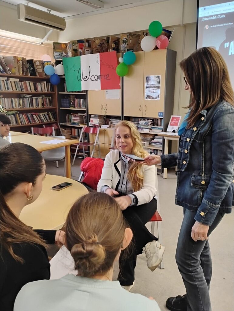 Κατά τη διάρκεια της υποδοχής της ιταλικής Erasmus+ Group Mobility στο σχολείο μας, υλοποιήθηκαν ποικίλες δραστηριότητες γνωριμίας, συνεργασίας και δημιουργικής έκφρασης. Ωστόσο, μία από τις πιο εμβληματικές στιγμές αυτής της συνάντησης ήταν η συνέντευξη που πραγματοποίησαν οι μαθητές της ομάδας Erasmus με την υπεύθυνη της ιταλικής κινητικότητας, κα. Nadia Travaglione και τις μαθήτριές της μέλη της χορωδίας.